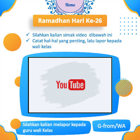 Home Ramadhan Hari Ke-26 ✓ Silahkan kalian simak video dibawah ini ✓ Catat hal-hal yang penting, lalu lapor kepada wali kelas Silahkan kalian melapor kepada G-from/WA guru wali Kelas