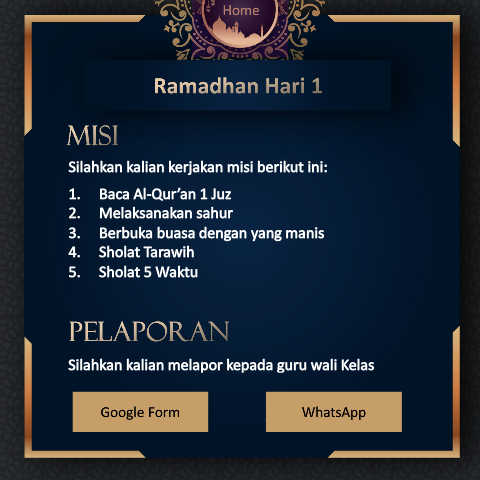 Home 1 Silahkan kalian kerjakan misi berikut ini: 1. Baca Al-Qur’an 1 Juz 2. Melaksanakan sahur 3. Berbuka buasa dengan yang manis 4. Sholat Tarawih 5. Sholat 5 Waktu Silahkan kalian melapor kepada guru wali Kelas Google Form WhatsApp