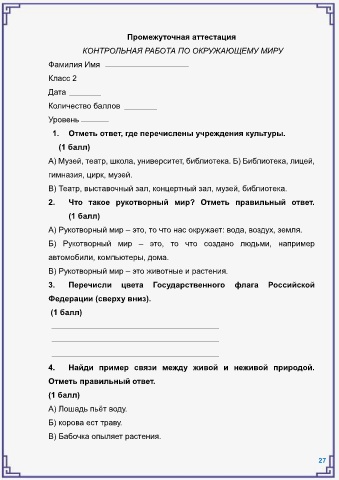 КОНТРОЛЬНАЯ РАБОТА ПО ОКРУЖАЮЩЕМУ МИРУ