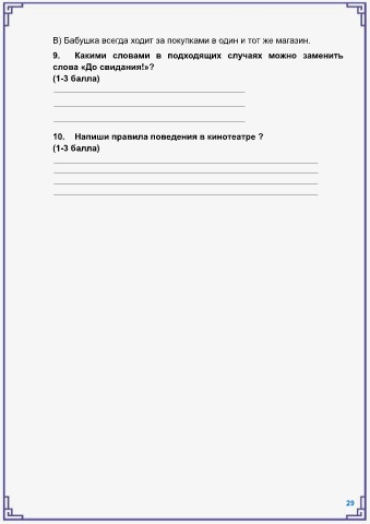 В) Бабушка всегда ходит за покупками в один и тот же магазин. 9. Какими словами в подходящих случаях можно заменить слова «До свидания!»? (1-3 балла) 10. Напиши правила поведения в кинотеатре ? (1-3 балла) 29