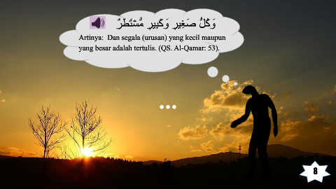 ٌرَطَﺗ ۡﺳﱡﻣ ٖرﯾِﺑَﻛ َو ٖرﯾِﻐَﺻ ﱡلُﻛ َو Artinya: Dan segala (urusan) yang kecil maupun yang besar adalah tertulis. (QS. Al-Qamar: 53). 8
