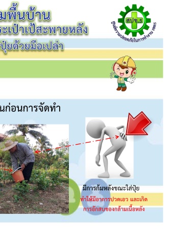 มีการใช้มือเปล่าสัมผัสสารเคมี                            มีการก้มหลังขณะใส่ปุ๋ย