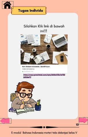 Tugas Individu Silahkan Klik link di bawah ini!!! https://app.quizwhizzer.com/quiz/6666c513a7e7f60 00f5fef73 13 E-modul Bahasa Indonesia materi teks deksripsi kelas V