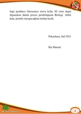 bagi pembaca khususnya siswa kelas XI serta dapat digunakan dalam proses pembelajaran Biologi. Akhir kata, penulis mengucapkan terima kasih. Pekanbaru, Juli 2021 Ria Mariati 2