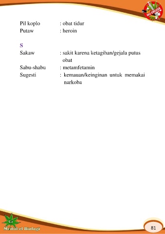 Pil koplo : obat tidur Putaw : heroin S Sakaw : sakit karena ketagihan/gejala putus obat Sabu-shabu : metamfetamin Sugesti : kemauan/keinginan untuk memakai narkoba 81