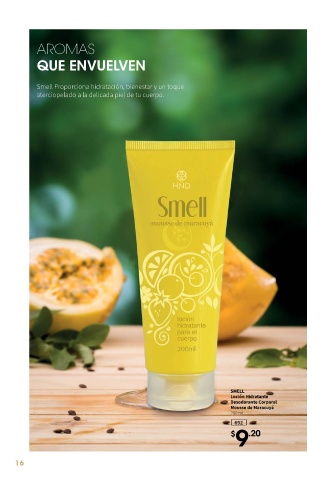 AROMAS QUE ENVUELVEN Smell Proporciona hidratación, bienestar y un toque aterciopelado a la delicada piel de tu cuerpo. SMELL Loción Hidratante Desodorante Corporal Mousse de Maracuyá 200 ml Incluye IVA 692 9 $ .20 16