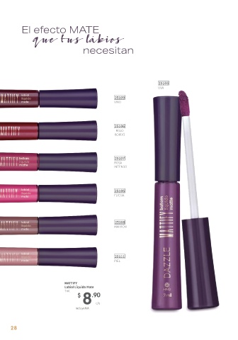 El efecto MATE que tus lábios necesitan 25103 UVA 25109 VINO 25106 ROJO BORDÓ 25107 ROSA INTENSO 25105 FUCSIA 25108 MARRÓN 25111 PIEL MATTIFY Labial Líquido Mate 7ml $ 8 .90 Incluye IVA c/u 28