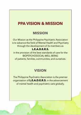 Our Mission as the Philippine Psychiatric Association is to advance the field of Mental Health and Psychiatry through the development of its members as