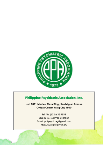 Philippine Psychiatric Association, Inc. Unit 1011 Medical Plaza Bldg., San Miguel Avenue Ortigas Center, Pasig City 1600 Tel. No. (632) 635 9858 Mobile No. (63) 918 9424864 E-mail. philpsych.org@gmail.com http://www.philpsych.ph/
