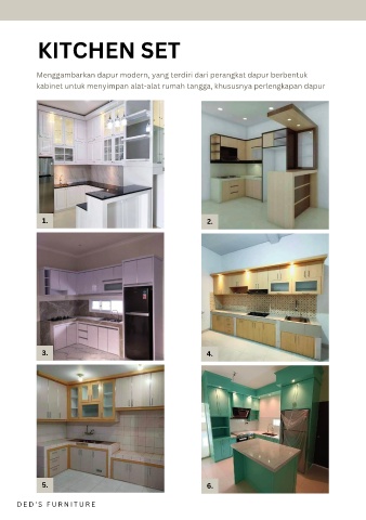 KITCHEN SET Menggambarkan dapur modern, yang terdiri dari perangkat dapur berbentuk kabinet untuk menyimpan alat-alat rumah tangga, khususnya perlengkapan dapur 1. 2. 3. 4. 5. 6. D E D ' S F U R N I T U R E