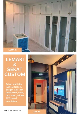 LEMARI LEMARI & SEKAT CUSTOM Bahan multiplex kualitas terbaik, dengan lapis luar, pilihan HPL, duco, taco sheet, sticker PVC sesuai permintaan D E D ' S F U R N I T U R E SEKAT