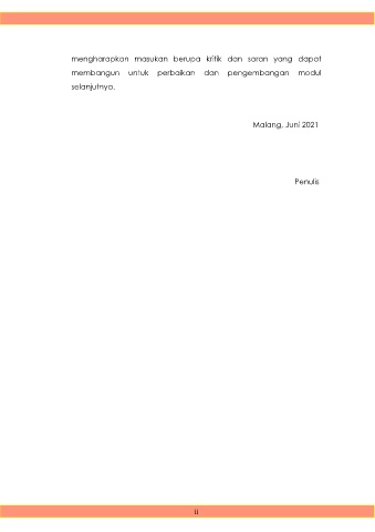 mengharapkan masukan berupa kritik dan saran yang dapat membangun untuk perbaikan dan pengembangan modul selanjutnya. Malang, Juni 2021 Penulis ii
