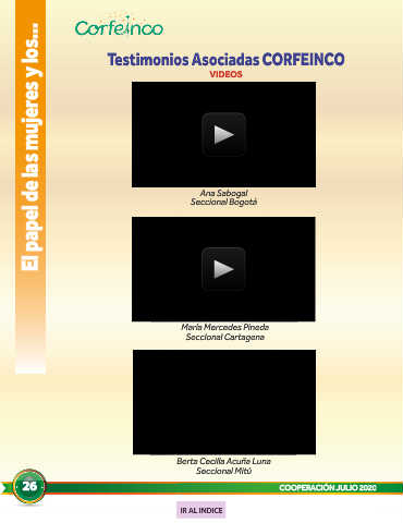 ASOCIACIÓN MUTUAL El papel de las mujeres y los... Testimonios Asociadas CORFEINCO VIDEOS Ana Sabogal Seccional Bogotá María Mercedes Pineda Seccional Cartagena Berta Cecilia Acuña Luna Seccional Mitú 26 COOPERACIÓN JULIO 2020 IR AL INDICE