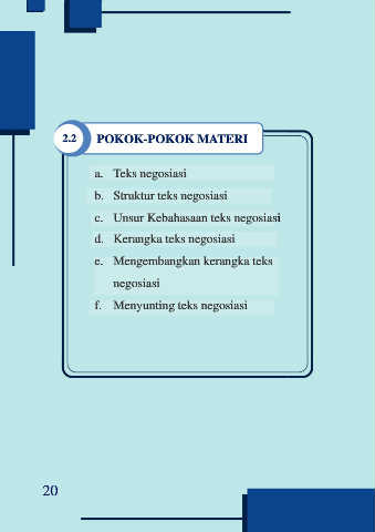 POKOK-POKOK MATERI 2.2 POKOK-POKOK MATERI a. Teks negosiasi b. Struktur teks negosiasi c. Unsur Kebahasaan teks negosiasi d. Kerangka teks negosiasi e. Mengembangkan kerangka teks negosiasi f. Menyunting teks negosiasi 20