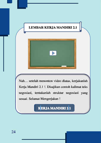 LEMBAR KERJA MANDIRI 2.1 Nah… setelah menonton video diatas, kerjakanlah Kerja Mandiri 2.1 !. Disajikan contoh kalimat teks negosiasi, tentukanlah struktur negosiasi yang sesuai. Selamat Mengerjakan ! KERJA MANDIRI 2.1 24