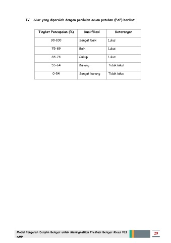 IV. Skor yang diperoleh dengan penilaian acuan patokan (PAP) berikut.