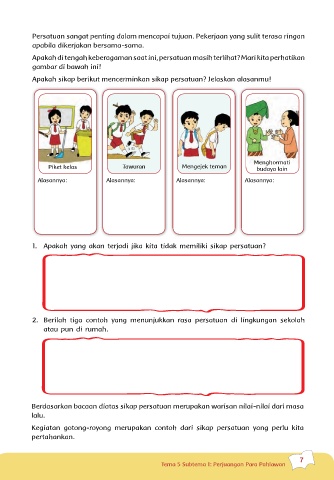 2. Berilah tiga contoh yang menunjukkan rasa persatuan di lingkungan sekolah