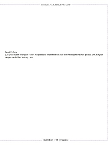 GLUKOSA NAIK, TUBUH MENJERIT Panel 2: Cuka [Disajikan informasi singkat terkait manfaat cuka dalam menstabilkan atau mencegah lonjakan glukosa. Dihubungkan dengan sabda Nabi tentang cuka] NutriChem | 49 | Magazine