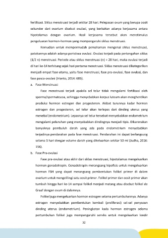 fertilisasi. Siklus menstruasi terjadi sekitar 28 hari. Pelepasan ovum yang berupa oosit
