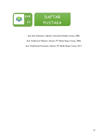 BAB DAFTAR IV PUSTAKA Kue-Kue Indonesia. Jakarta: Gramedia Pustaka Utama, 2008. Kue Tradisional Modern. Jakarta: PT Media Boga Utama, 2008. Kue Tradisional Nusantara. Jakarta: PT Media Boga Utama, 2013. 21