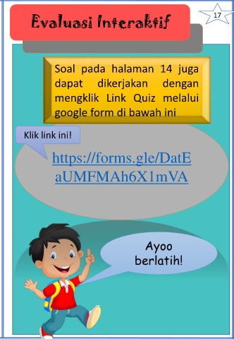 Evaluasi Interaktif 17 Soal pada halaman 14 juga dapat dikerjakan dengan mengklik Link Quiz melalui google form di bawah ini Klik link ini! https://forms.gle/DatE aUMFMAh6X1mVA Ayoo berlatih!