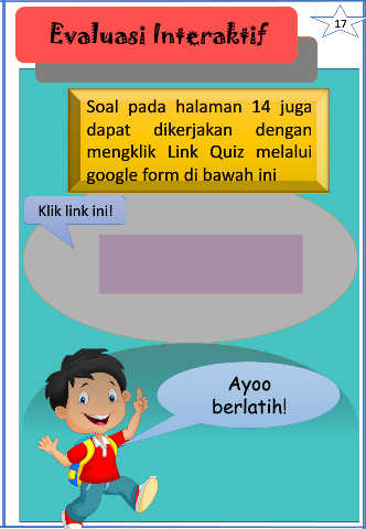 Evaluasi Interaktif 17 Soal pada halaman 14 juga dapat dikerjakan dengan mengklik Link Quiz melalui google form di bawah ini Klik link ini! Ayoo berlatih!