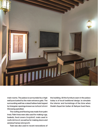 the building. All the furniture seen in the palace today is of local traditional design, to simulate the interior and furnishings of the time when Sheikh Zayed bin Sultan Al Nahyan lived there.