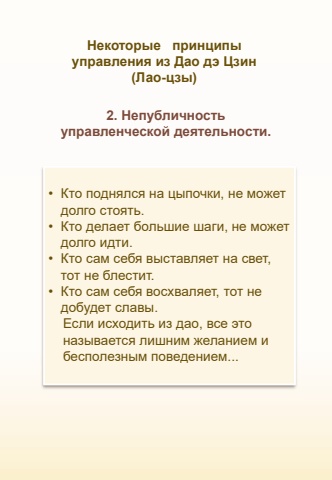 %u2022 %u041a%u0442%u043e %u043f%u043e%u0434%u043d%u044f%u043b%u0441%u044f %u043d%u0430 %u0446%u044b%u043f%u043e%u0447%u043a%u0438, %u043d%u0435 %u043c%u043e%u0436%u0435%u0442 %u0434%u043e%u043b%u0433%u043e %u0441%u0442%u043e%u044f%u0442%u044c. %u2022 %u041a%u0442%u043e %u0434%u0435%u043b%u0430%u0435%u0442 %u0431%u043e%u043b%u044c%u0448%u0438%u0435 %u0448%u0430%u0433%u0438, %u043d%u0435 %u043c%u043e%u0436%u0435%u0442 %u0434%u043e%u043b%u0433%u043e %u0438%u0434%u0442%u0438. %u2022 %u041a%u0442%u043e %u0441%u0430%u043c %u0441%u0435%u0431%u044f %u0432%u044b%u0441%u0442%u0430%u0432%u043b%u044f%u0435%u0442 %u043d%u0430 %u0441%u0432%u0435%u0442, %u0442%u043e%u0442 %u043d%u0435 %u0431%u043b%u0435%u0441%u0442%u0438%u0442. %u2022 %u041a%u0442%u043e %u0441%u0430%u043c %u0441%u0435%u0431%u044f %u0432%u043e%u0441%u0445%u0432%u0430%u043b%u044f%u0435%u0442, %u0442%u043e%u0442 %u043d%u0435 %u0434%u043e%u0431%u0443%u0434%u0435%u0442 %u0441%u043b%u0430%u0432%u044b. %u0415%u0441%u043b%u0438 %u0438%u0441%u0445%u043e%u0434%u0438%u0442%u044c %u0438%u0437 %u0434%u0430%u043e, %u0432%u0441%u0435 %u044d%u0442%u043e %u043d%u0430%u0437%u044b%u0432%u0430%u0435%u0442%u0441%u044f %u043b%u0438%u0448%u043d%u0438%u043c %u0436%u0435%u043b%u0430%u043d%u0438%u0435%u043c %u0438 %u0431%u0435%u0441%u043f%u043e%u043b%u0435%u0437%u043d%u044b%u043c %u043f%u043e%u0432%u0435%u0434%u0435%u043d%u0438%u0435%u043c... %u041d%u0435%u043a%u043e%u0442%u043e%u0440%u044b%u0435 %u043f%u0440%u0438%u043d%u0446%u0438%u043f%u044b %u0443%u043f%u0440%u0430%u0432%u043b%u0435%u043d%u0438%u044f %u0438%u0437 %u0414%u0430%u043e %u0434%u044d %u0426%u0437%u0438%u043d (%u041b%u0430%u043e-%u0446%u0437%u044b)2. %u041d%u0435%u043f%u0443%u0431%u043b%u0438%u0447%u043d%u043e%u0441%u0442%u044c%u0443%u043f%u0440%u0430%u0432%u043b%u0435%u043d%u0447%u0435%u0441%u043a%u043e%u0439 %u0434%u0435%u044f%u0442%u0435%u043b%u044c%u043d%u043e%u0441%u0442%u0438.