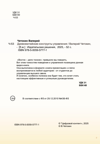 %u00ab%u0412%u043e%u0441%u0442%u043e%u043a %u2013 %u0434%u0435%u043b%u043e %u0442%u043e%u043d%u043a%u043e%u0435%u00bb- %u043f%u0440%u0438%u0432%u044b%u043a%u043b%u0438 %u043c%u044b %u0433%u043e%u0432%u043e%u0440%u0438%u0442%u044c.%u0412%u043e%u0442 %u044d%u0442%u0438%u043c %u0442%u043e%u043d%u043a%u043e%u0441%u0442%u044f%u043c %u043f%u043e%u0432%u0435%u0434%u0435%u043d%u0438%u044f %u0438 %u0443%u043f%u0440%u0430%u0432%u043b%u0435%u043d%u0438%u044f %u043f%u043e%u0441%u0432%u044f%u0449%u0435%u043d%u0430 %u0434%u0430%u043d%u043d%u0430%u044f %u0432%u0438%u0434%u0435%u043e-%u043a%u043d%u0438%u0433%u0430.%u041e%u043d%u0430 %u0432%u044b%u043f%u043e%u043b%u043d%u0435%u043d%u0430 %u0432 %u0444%u043e%u0440%u043c%u0430%u0442%u0435 %u00ab%u043a%u043d%u0438%u0433%u0430-%u043f%u0440%u0435%u0437%u0435%u043d%u0442%u0430%u0446%u0438%u044f%u00bb %u0438 %u043b%u0435%u0433%u043a%u043e %u0432%u043e%u0441%u043f%u0440%u0438%u043d%u0438%u043c%u0430%u0435%u0442%u0441%u044f %u0432 %u043b%u044e%u0431%u043e%u0439 %u0430%u0443%u0434%u0438%u0442%u043e%u0440%u0438%u0438 - %u043e%u0442 %u0441%u0442%u0443%u0434%u0435%u043d%u0442%u043e%u0432 %u0434%u043e %u0443%u043f%u0440%u0430%u0432%u043b%u0435%u043d%u0446%u0435%u0432 %u0432%u044b%u0441%u0448%u0435%u0433%u043e %u0437%u0432%u0435%u043d%u0430.%u0418 %u043a%u043e%u043d%u0435%u0447%u043d%u043e, %u043e%u0441%u043e%u0431%u0435%u043d%u043d%u043e %u043f%u043e%u043b%u0435%u0437%u043d%u0430 %u043e%u043d%u0430 %u0431%u0443%u0434%u0435%u0442 %u0442%u0435%u043c, %u043a%u0442%u043e %u0445%u043e%u0447%u0435%u0442 %u0441%u0442%u0430%u0442%u044c %u043d%u0430%u0441%u0442%u043e%u044f%u0449%u0438%u043c %u044d%u0444%u0444%u0435%u043a%u0442%u0438%u0432%u043d%u044b%u043c %u0438 %u0443%u0441%u043f%u0435%u0448%u043d%u044b%u043c %u0440%u0443%u043a%u043e%u0432%u043e%u0434%u0438%u0442%u0435%u043b%u0435%u043c.%u0427%u0435%u0442%u043e%u043a%u0438%u043d %u0412%u0430%u043b%u0435%u0440%u0438%u0439%u0414%u0440%u0435%u0432%u043d%u0435%u043a%u0438%u0442%u0430%u0439%u0441%u043a%u0438%u0435 %u043a%u043e%u043d%u0441%u0442%u0440%u0443%u043a%u0442%u044b %u0443%u043f%u0440%u0430%u0432%u043b%u0435%u043d%u0438%u044f / %u0412%u0430%u043b%u0435%u0440%u0438%u0439 %u0427%u0435%u0442%u043e%u043a%u0438%u043d,- [%u0431.%u043c.] : %u0418%u0437%u0434%u0430%u0442%u0435%u043b%u044c%u0441%u043a%u0438%u0435 %u0440%u0435%u0448%u0435%u043d%u0438%u044f, 2025, - 52 %u0441.ISBN 978-5-0059-5777-1%u00a9 \%u00a9 %u0412.%u0427%u0435%u0442%u043e%u043a%u0438%u043d%u0423%u0414%u041a 31%u0411%u0411%u041a 60%u0427-5316+2%u0427-53%u0423%u0414%u041a 31%u0411%u0411%u041a-60%u0412 %u0441%u043e%u043e%u0442%u0432%u0435%u0442%u0441%u0442%u0432%u0438%u0438 %u0441 %u0424%u0417 %u043e%u0442 29.12.2010 %u2116436-%u0424%u0417ISBN 978-5-0059-5777-1