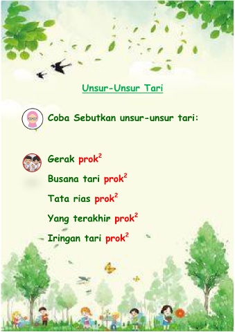 Unsur-Unsur Tari Coba Sebutkan unsur-unsur tari: 2 Gerak prok 2 Busana tari prok 2 Tata rias prok 2 Yang terakhir prok 2 Iringan tari prok 34