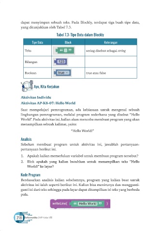 dapat menyimpan sebuah teks. Pada Blockly, terdapat tiga buah tipe data,