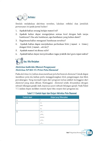 Tabel 7.7: Contoh Input dan Output Aktivitas Pola Diamond