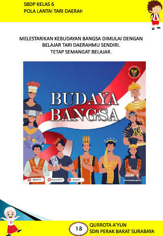 SBDP KELAS 6 POLA LANTAI TARI DAERAH MELESTARIKAN KEBUDAYAN BANGSA DIMULAI DENGAN BELAJAR TARI DAERAHMU SENDIRI. TETAP SEMANGAT BELAJAR. 18 QURROTA A’YUN SDN PERAK BARAT SURABAYA