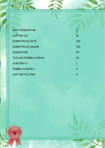 KATA PENGANTAR I DAFTAR ISI II KOMPETENSI INTI III KOMPETENSI DASAR III INDIKATOR IV TUJUAN PEMBELAJARAN IV SUBTEMA 3 : 1 PEMBELAJARAN 3 2 DAFTAR PUSTAKA 6 II