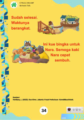 Sudah selesai. Waktunya berangkat. Ini kue bingka untuk Nara. Semoga kaki Nara cepat sembuh. Sumber: Herliana, L. (2022). Kue Kimu. Jakarta: Pusat Perbukuan Kemdikbudristek. 34
