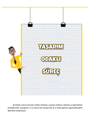 Bu ünitede, tasarım sürecinin; problem tanımlama, araştırma, planlama, oluşturma ve değerlendirme