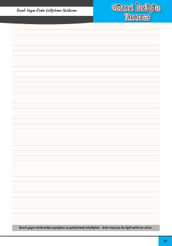 TEKNOLOJİ VE TASARIMIN TEMELLERİ Basılı Yayın Ürün Geliştirme Notlarım Teknoloji ve Tasarımı Öğreniyorum Basılı yayın türlerinden seçtiğiniz ve geliştirmek istediğiniz ürün tasarımı ile ilgili notlarını alınız. 55