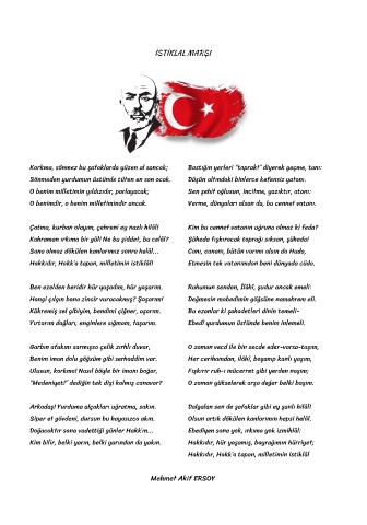Arkadaş! Yurduma alçakları uğratma, sakın. Dalgalan sen de şafaklar gibi ey şanlı hilâl!