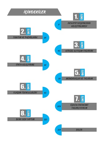 İNOVATİF DÜŞÜNCENİN 9 GELİŞTİRİLMESİ TANITIM VE PAZARLAMA 25 43 GÖRSEL İLETİŞİM TASARIMI ÜRÜN GELİŞTİRME 61 77 MÜHENDİSLİK VE TASARIM ULAŞIM TEKNOLOJİLERİ 93 ÖZGÜN ÜRÜNÜMÜ 109 TASARLIYORUM BUNU BEN YAPTIM 123 127 EKLER 8