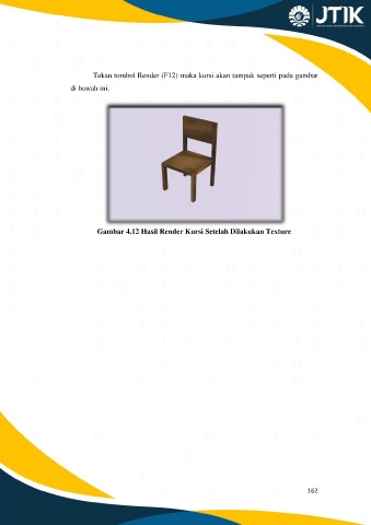Tekan tombol Render (F12) maka kursi akan tampak seperti pada gambar di bawah ini. Gambar 4.12 Hasil Render Kursi Setelah Dilakukan Texture 162