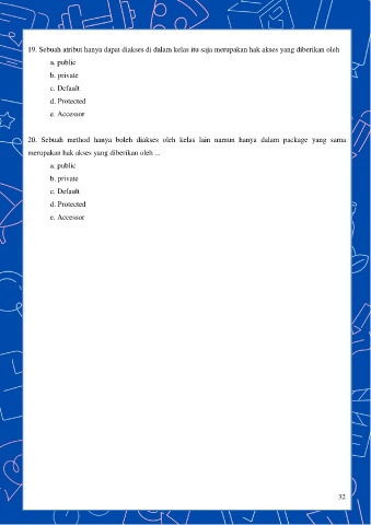 20. Sebuah method hanya boleh diakses oleh kelas lain namun hanya dalam package yang sama