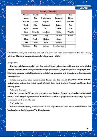 Catatan: true, false, dan null bukan termasuk kata kunci akan tetapi mereka termasuk kata-kata khusus,