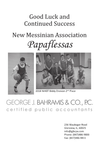 Good Luck and Continued Success New Messinian Association Papaflessas nd 2018 NHIBT Biddy Division 2 Place 236 Waukegan Road Glenview, IL, 60025 info@gjbcpa.com Phone: (847)486-9800 Fax: (847)486-9811