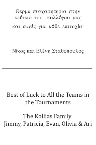 4HUPά VXJFDUKWήULD VWKQ HSέWHLR WRX VXOOόJRX PD9 NDL HXFέ9JLD NάTH HSLWXFίD 1ίNR9 NDL (OέQK 6WDTόSRXOR9 Best of Luck to All the Teams in the Tournaments The Kollias Family Jimmy, Patricia, Evan, Olivia & Ari