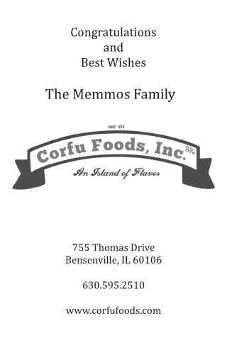 Congratulations and Best Wishes The Memmos Family 755 Thomas Drive Bensenville, IL 60106 630.595.2510 www.corfufoods.com