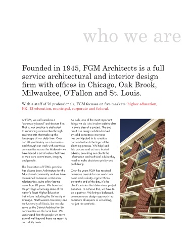 With a staff of 78 professionals, FGM focuses on five markets: higher education,