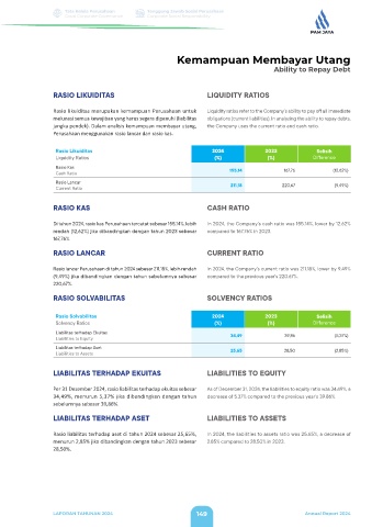 Di tahun 2024, rasio kas Perusahaan tercatat sebesar 155,14%, lebih In 2024, the Company’s cash ratio was 155.14%, lower by 12.62%