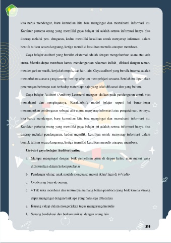 Gaya belajar Auditori (Auditory Learners) mengan- dalkan pada pendengaran untuk bisa