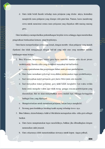 d. Guru tidak boleh fanatik terhadap mata pelajaran yang diteku- ninya, kemudian