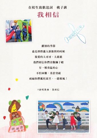 在校生致歡送詞 桃子班 我相信 離別的季節 也是即將邁入新旅程的時候 親愛的大哥哥、大姐姐 我們相信你們會像獅子般 有一顆勇猛的心 不怕困難,勇於突破 祝福你們鵬程萬里,一路順風! #演唱歌曲:我相信